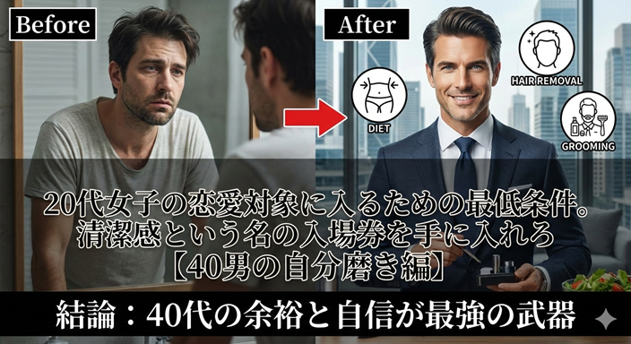 残酷な現実を言います。20歳の彼女たちにとって、手入れされていない40代の男は「ただのおじさん」どころか、「生理的に無理な対象」になりかねません。